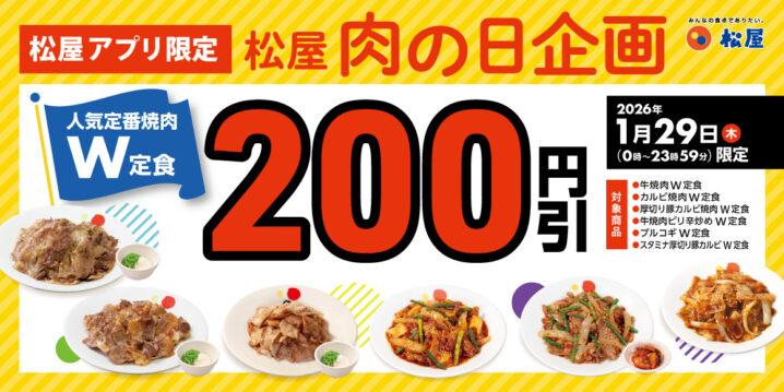 松屋は2026年1月29日限定で、「肉の日」を記念して定番焼肉定食のWサイズを200円引きにて販売します。