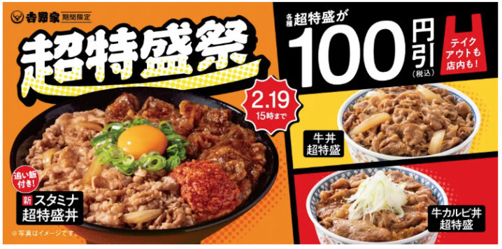 吉野家は2026年2月5日11時〜19日15時の期間、各種超特盛が100円引きになる『超特盛祭』を開催します。