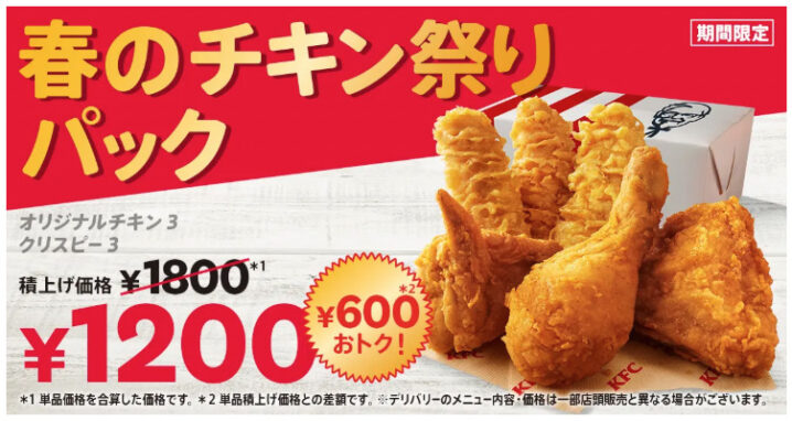 「春のチキン祭りパック」は、オリジナルチキン3ピースとカーネルクリスピー3ピースが入った、食べ応え抜群のパックです。