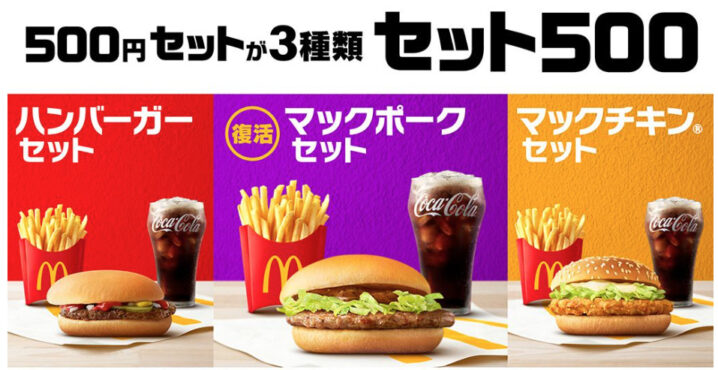 『セット500』にマックポークを加え、ワンコインの500円ちょうどで楽しめる“500円セット”を3種類に拡充です。