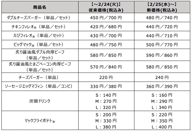 マクドナルドは2026年2月25日より商品を値上げします。