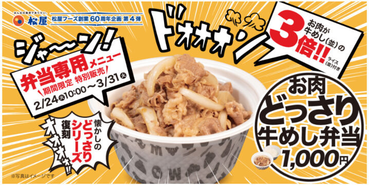 松屋は2026年2月24日10時〜3月31日10時の期間、松屋60周年企画としてお持ち帰り限定の「お肉どっさり牛めし弁当」を発売しています。