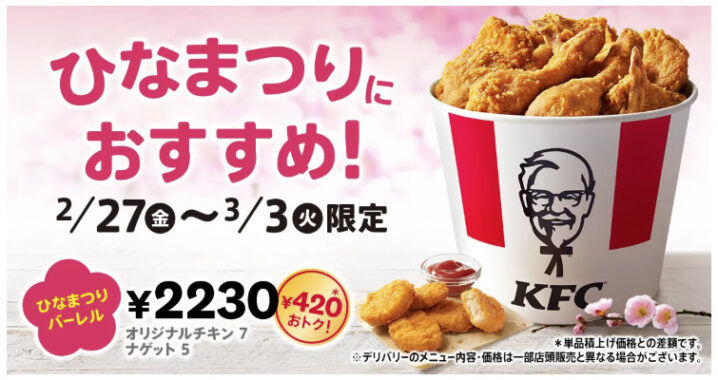 ケンタッキーは2026年2月27日〜3月3日の期間、お得な「ひなまつりバーレル」を発売します。