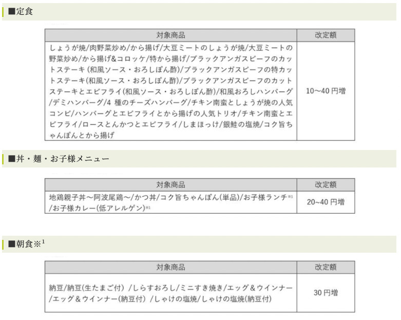 定食は10円〜40円の値上げ、丼・麺・お子様メニューは20円〜40円の値上げ、朝食は30円の値上げです。