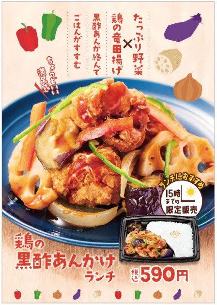 「鶏の黒酢あんかけランチ」は、鶏の竜田揚げ、なす、たまねぎ、れんこん、ピーマン、パプリカ、の5種類の野菜と鶏の竜田揚げに、甘酸っぱい黒酢あんをたっぷり絡めた、ごはんが進む味わいです。
