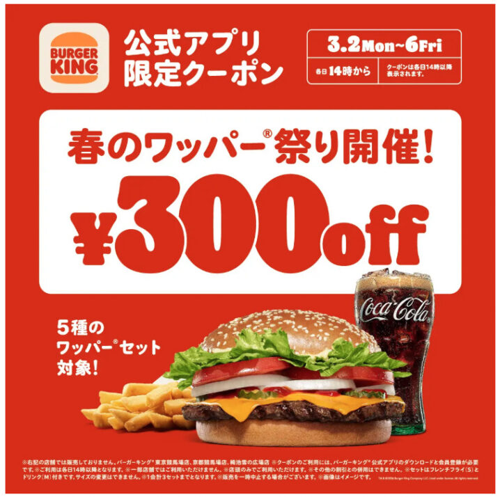 バーガーキングは2026年3月2日〜6日の各日14時から、5種のワッパーセットが300円引きになるクーポンをアプリにて配布します。