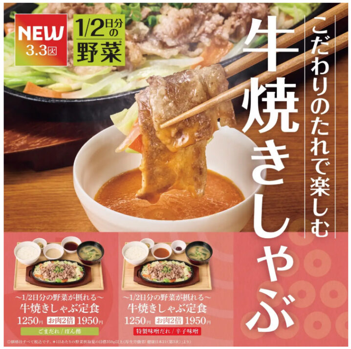 また、より満足感を求める方向けに『~1/2日分の野菜が摂れる~【お肉2倍】牛焼きしゃぶ定食』1,950円も用意します。