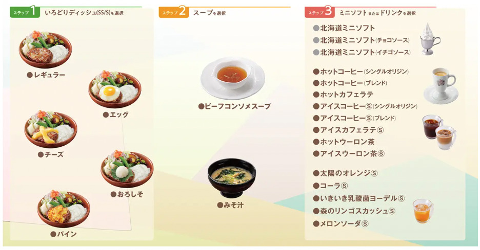 「いろどりセット」は、ハンバーグとライスに、スープ、ミニソフトまたはドリンクの中からそれぞれ1つずつお好きな商品を選ぶことができます。