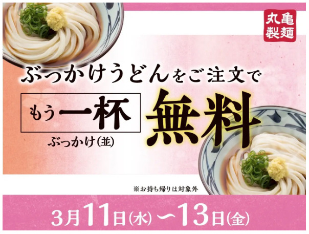 丸亀製麺は2026年3月11日〜13日の期間、『ぶっかけうどん』を注文すると『ぶっかけうどん(並)』を一杯無料で提供します。