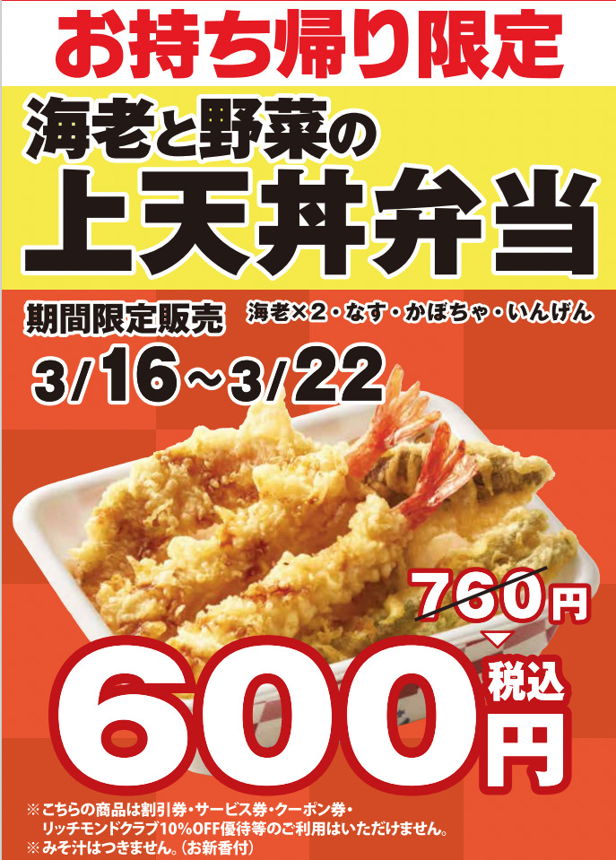 キャンペーンでは、通常価格760円の「海老と野菜の上天丼弁当」をテイクアウト限定で600円にて販売します。