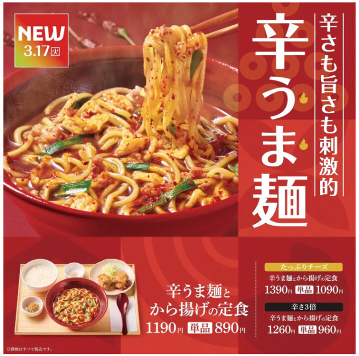 やよい軒は2026年3月17日より、もっちり太麺に辛うまスープが絡む『辛うま麺』を販売します。
