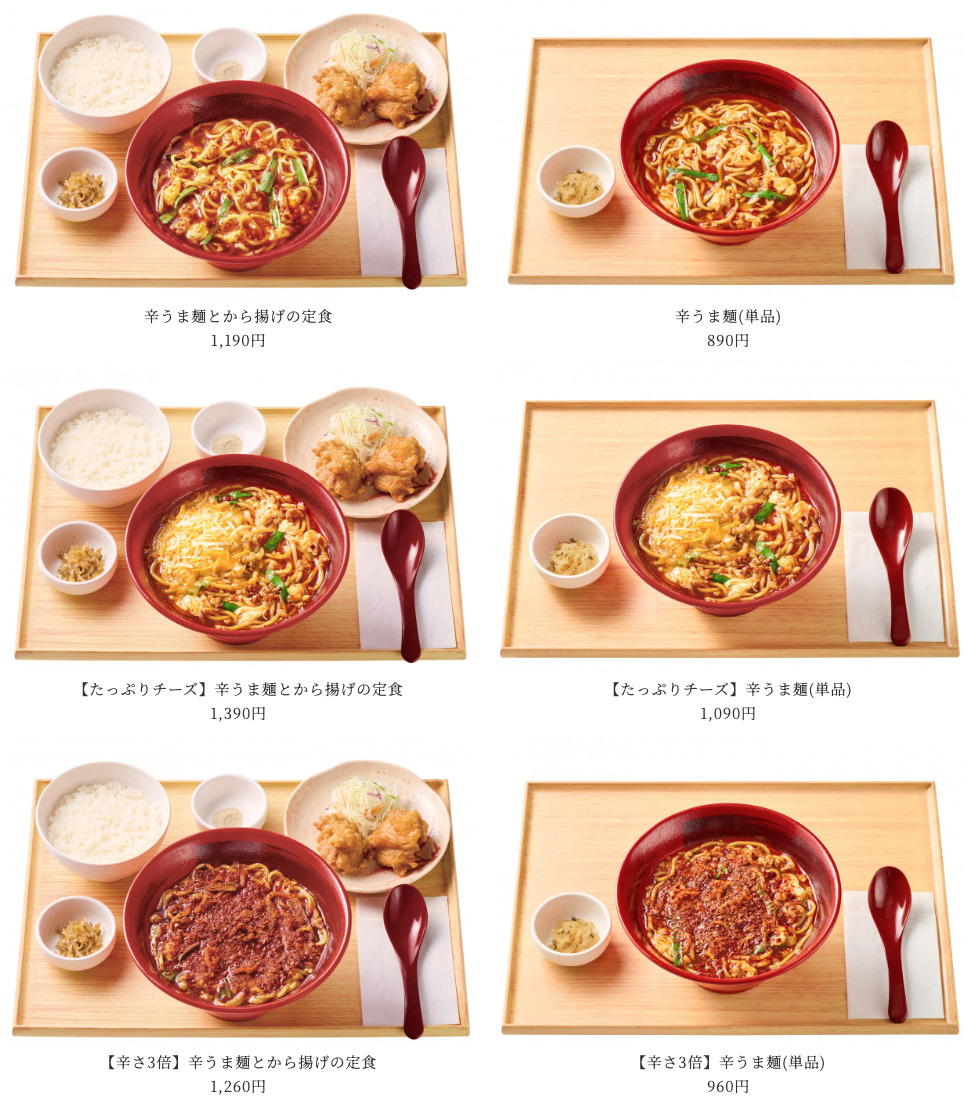 販売するのは、『辛うま麺とから揚げの定食』、『辛うま麺(単品)』、『【たっぷりチーズ】辛うま麺とから揚げの定食』、『【たっぷりチーズ】辛うま麺(単品)』、『【辛さ3倍】辛うま麺とから揚げの定食』、『【辛さ3倍】辛うま麺(単品)』です。