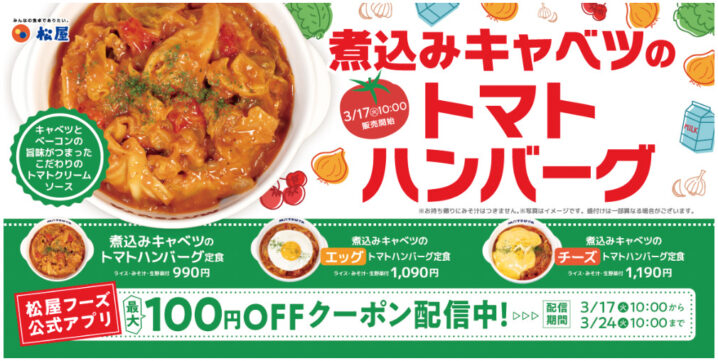 松屋は2026年3月17日10時より「煮込みキャベツのトマトハンバーグ定食」を販売します。