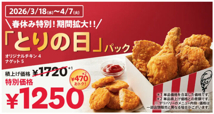 ケンタッキーは毎月28日は『にわとりの日』として、お得な「とりの日パック」を販売しています。