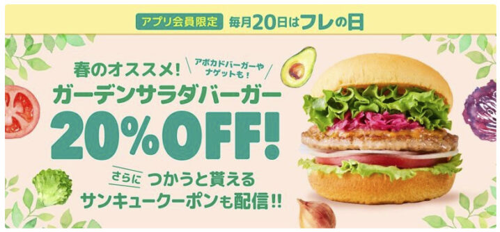 2026年3月20日の「フレの日」は、対象のハンバーガー・サイドメニューが20%OFFです。