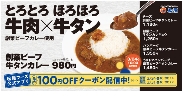 松屋は2026年3月24日10時より「創業ビーフ牛タンカレー」を販売します。