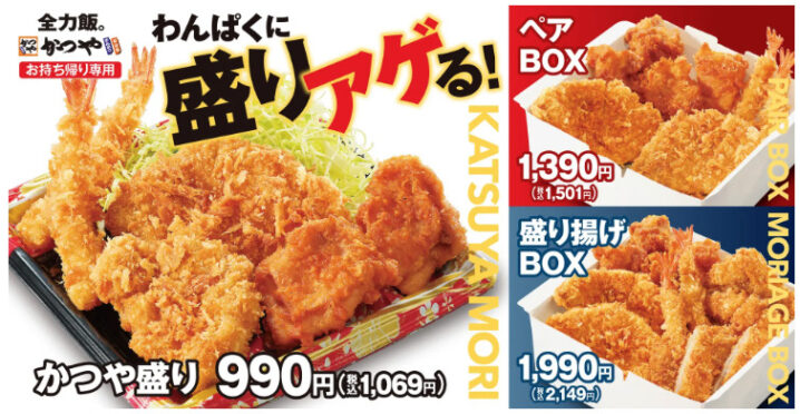 発売するのは「かつや盛り」「ペアBOX」「盛り揚げBOX」です。