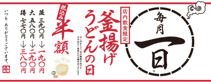 丸亀製麺は、毎月1日に「釜揚げうどんの日」として釜揚げうどん半額セールを実施します。