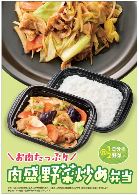 「肉盛野菜炒め弁当」は、たっぷりのお肉と1/2日分の野菜で、食べ応え抜群の一品に仕上げています。