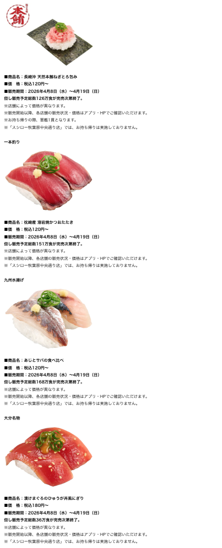 フェアでは、「長崎沖 天然本鮪ねぎとろ包み」と「枕崎産 溶岩焼かつおたたき」、「あじとサバの食べ比べ」を税込120円~で提供。