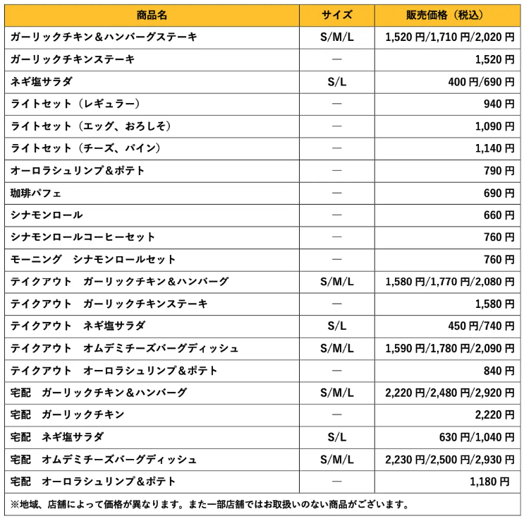 グランドメニューには、「ライトセット」「ガーリックチキン&ハンバーグステーキ」「ガーリックチキンステーキ」をはじめ、「ネギ塩サラダ」や「珈琲パフェ」など8品が定番商品に新たに加わります。