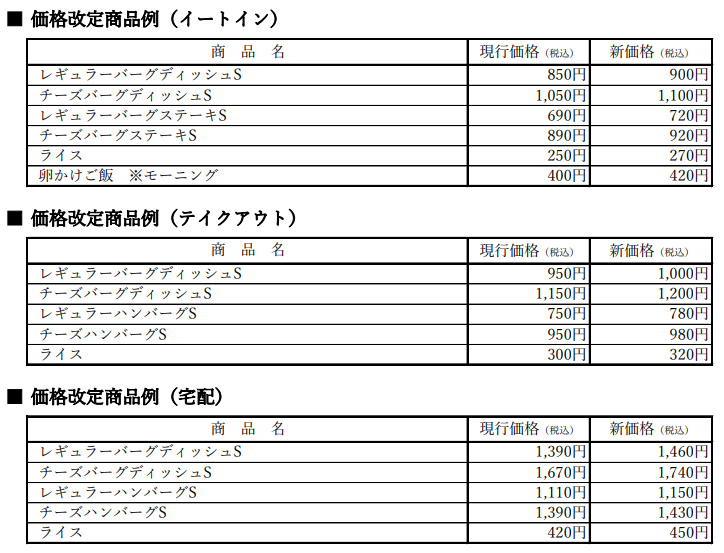 バーグディッシュは50円の値上げ、ステーキは30円の値上げ、など。