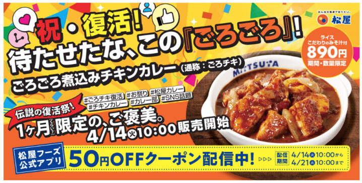 松屋は2026年4月14日10時より、「ごろごろ煮込みチキンカレー」を復活販売します。