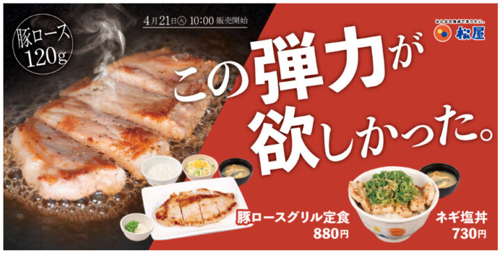 松屋は2026年4月21日10時より「豚ロースグリル定食」を販売します。