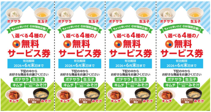 松屋は2026年4月21日より、お得な「サイドメニュー1品無料サービス券」を配布しています。