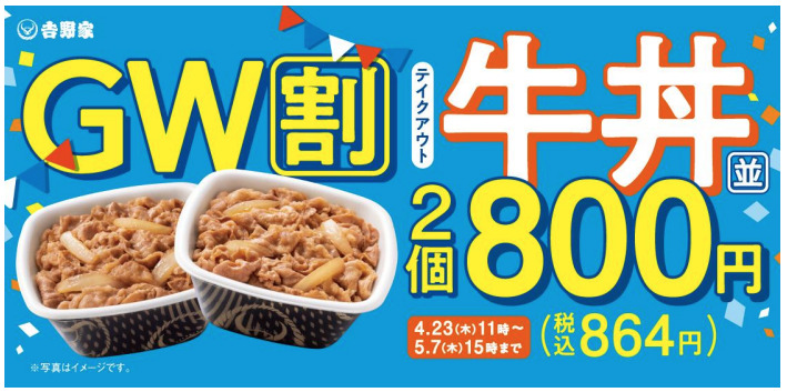 吉野家は2026年4月23日11時〜5月7日15時の期間、「牛丼弁当2丁800円キャンペーン」を実施しています。