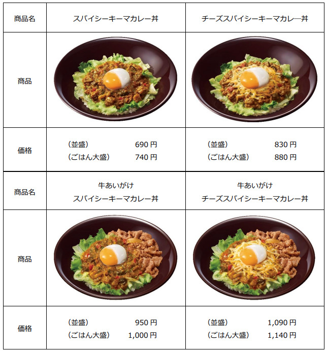 同時に、キーマカレーのスパイシーな味わいとミックスチーズのコクが相性抜群の「チーズスパイシーキーマカレー丼」830円〜や、秘伝のタレで煮た牛肉をトッピングした「牛あいがけスパイシーキーマカレー丼」950円〜、「牛あいがけチーズスパイシーキーマカレー丼」1,090円〜も販売します。