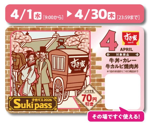 すき家、2026年4月1日より牛丼・カレー・旨だしとりそぼろ丼などが70円引きになるお得なカード「Sukipass」を販売