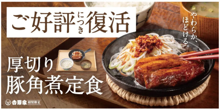 吉野家は2026年1月6日より「厚切り豚角煮定食」を期間限定で販売しています。 「厚切り豚角煮定食」は、とろけるほど柔らかい豚バラ肉を厚切りで仕上げ、ねぎラー油やからしを合わせることで味の変化も楽しめる満足度の高い商品で…