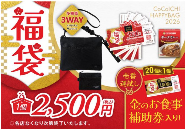 CoCo壱番屋は2025年12月26日より「2026年ココイチ福袋」を発売します。 「ココイチ福袋」は、オリジナルサコッシュ、お食事補助券 2,500円分(500円券×5枚)、オリジナルコイン&カードケース、レトルトポー…