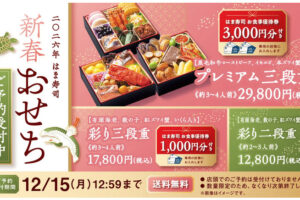 はま寿司は2025年10月7日より「2026年新春おせち」の予約を受け付けています。 おせち商品は、「プレミアム三段重」、「彩り三段重」、「彩り二段重」です。 「プレミアム三段重」は、イセエビなどの豪華な料理をはじめ、有…