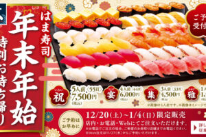 はま寿司は2025-2026年末年始の特別お持ち帰りメニューの予約を受け付けています。 こちらのメニューの販売期間は2025年12月20日〜2026年1月4日です。 2025-2026年年末年始の特別お持ち…