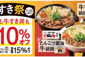 吉野家は2025年11月6日11時〜25日15時の期間、対象商品が10%オフになる『牛すき祭』を開催します。 キャンペーンでは、冬季限定の人気商品「牛すき鍋膳」をはじめ、「牛すき丼」など対象商品が税込価格から10%オフに…