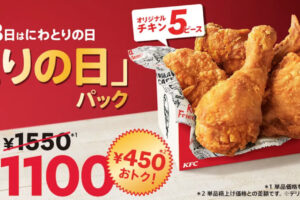 ケンタッキーは毎月28日は『にわとりの日』として、お得な「とりの日パック」を販売しています。 2025年9月28日も実施です。 とりの日パック内容 ・オリジナルチキン5個 価格は1,100円。 通常価格は1…