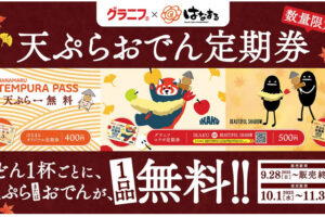はなまるうどんは2025年9月28日より、うどん1杯ごとに天ぷらまたはおでん1品が毎日無料になる「天ぷらおでん定期券」を発売します。 天ぷらおでん定期券では、好きなうどん1杯ごとに、天ぷらまたはおでん1品が無料になります…