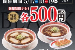 幸楽苑は2025年5月17日〜19日の期間、「郡山ブラック」「郡山ブラック素らーめん餃子セット」を数量限定無しで販売します。 「郡山ブラック」は、郡山市のご当地ラーメンで、たまり醬油を使った黒いスープが特徴のらーめんです…