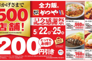 かつやは2025年5月22日〜25日の期間、人気の4品が200円引きになる「記念感謝祭」を開催します。 キャンペーンでは、定番の「カツ丼(竹)」、サクサクやわらかな”とんかつ”をシンプルに味わう「…