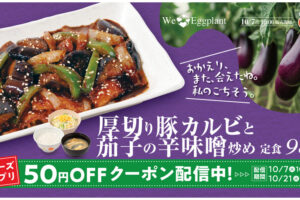 松屋は2025年10月7日10時より秋の風物詩「厚切り豚カルビと茄子の辛味噌炒め」を販売します。 「厚切り豚カルビと茄子の辛味噌炒め」は、厚切り豚カルビを使用し、噛むほどに旨みがあふれるお肉に、とろけるような食感の茄子・…