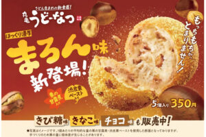 丸亀製麺は2025年10月7日より「丸亀うどーなつ」の新味として「まろん味」を販売します。 『丸亀うどーなつ まろん味』は、もっちもちの生地に素材を練り込む“しあわせもっちもち製法”で、「栗の甘露煮」と「渋皮栗ペースト」…