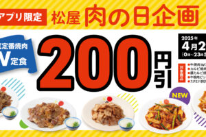 松屋は2025年4月29日限定で、「肉の日」を記念して定番焼肉定食のWサイズを200円引きにて販売します。 松屋フーズ公式アプリ「松弁ネット」「松屋モバイルオーダー」からの注文で、「牛焼肉定食」「カルビ焼肉定食」「厚切り…