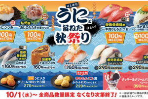 はま寿司は2025年10月1日より「はま寿司 うにと旨ねた秋祭り」を開催します。 フェアでは、天然ウニの濃厚な旨みと甘みを堪能できる「うにつつみ」をはじめ、特製味噌だれで和えた身の締まったアジを大葉と一緒に味わう「九州産…