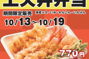 てんやは2025年10月13日〜19日の期間、テイクアウト限定で「海老といかの上天丼弁当」を600円で販売する「てんやweek」キャンペーンを実施します。 キャンペーンでは、通常価格770円の「海老といかの上天丼弁当」を…