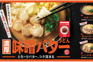 はなまるうどんは2025年10月9日〜11月中旬の期間、「味噌バター」「豚肉味噌バター」「ホタテ味噌バター」を販売しています。 スープは、いりこと昆布の奥深いかけだしに豚白湯を重ね、こだわりの赤味噌と白味噌を絶妙にブレン…