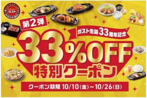 ガストは2025年10月10日〜26日の期間、ガスト生誕33周年を記念して 『33%OFF特別クーポン第2弾』を実施します。 すかいらーくアプリや公式SNS、新聞折り込みチラシにてクーポンを配布です。 クー…
