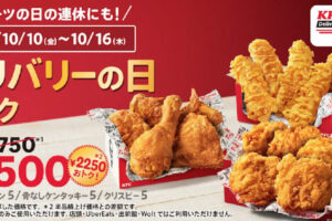 ケンタッキーは2025年10月10日〜16日の期間、お得に楽しめる「デリバリーの日パック」を発売しています。 対象商品は、チキン5個+骨なしケンタッキー5個+クリスピー5個のセットで、通常5,750円のところ3,500円…