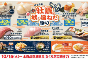 はま寿司は2025年10月15日より「はま寿司 うにと旨ねた秋祭り」を開催します。 フェアでは、浜茹でした牡蠣(かき)のぷりっとジューシーな食感が楽しめる「広島県産 牡蠣(かき)握り(もみじおろしのせ)」と、程よい歯ごた…